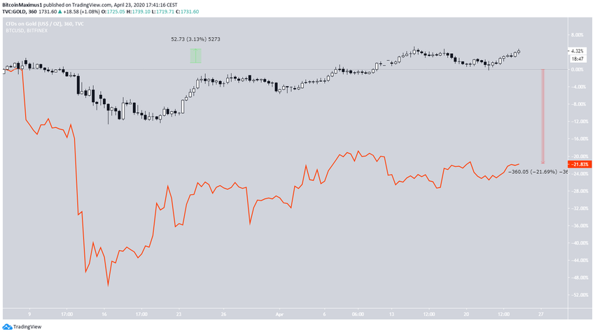 Сопоставление на графике ценовой динамики золота (свечи) и биткоина (оранжевая линия) демонстрирует, что ВТС гораздо хуже приходил в себя после обвала рынка 9-12 марта. По сравнению с уровнем 9 марта золото укрепилось на 3%, а биткоин подешевел на 21%.