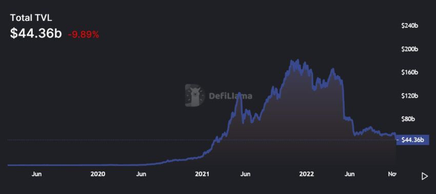 За последние сутки совокупная стоимость активов (TVL) на рынке децентрализованных финансов (DeFi) упала более чем на 9%. Сейчас TVL составляет $44,6 млрд. В последний раз такие значения фиксировались в марте 2021 года.
