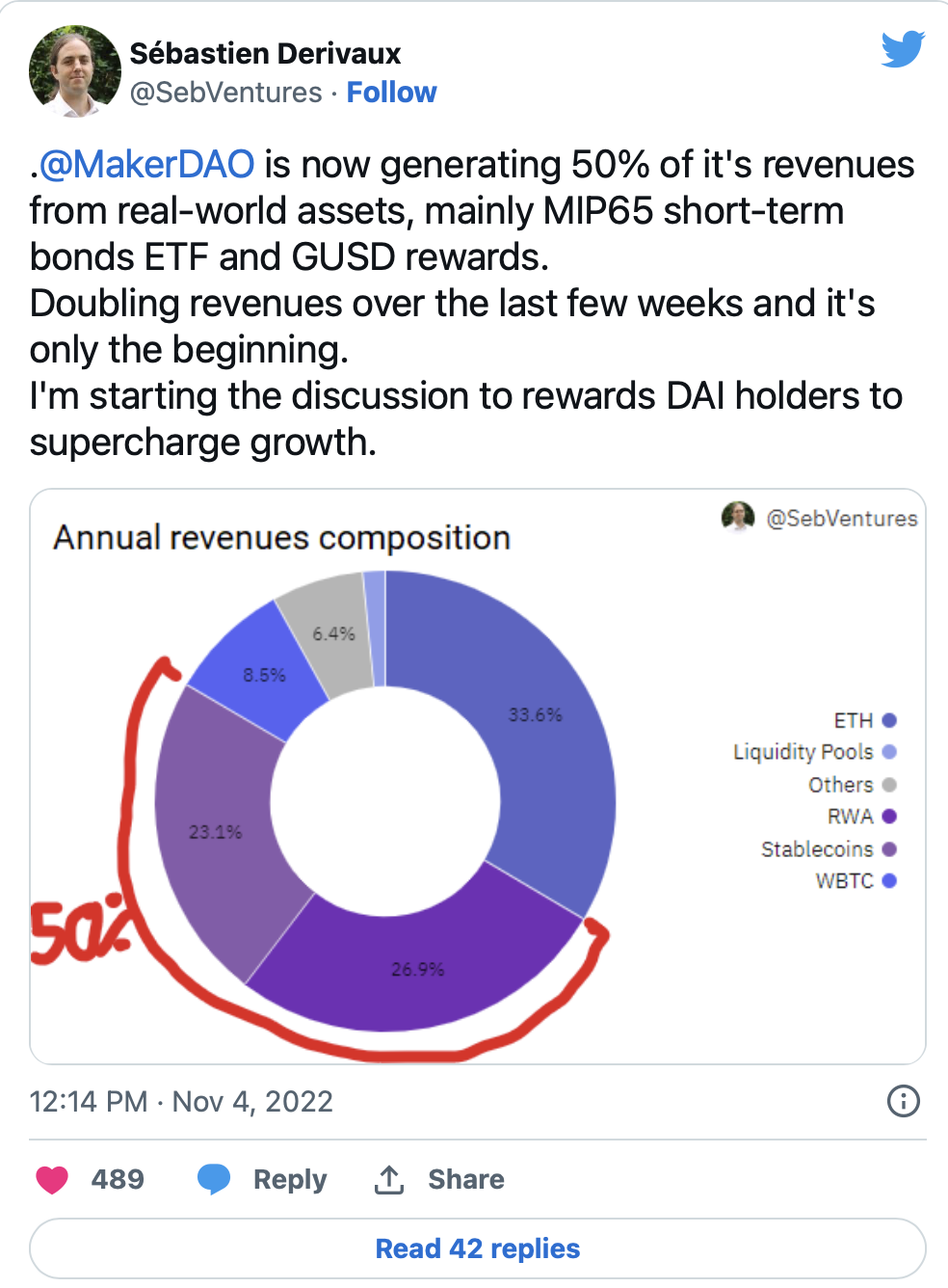 Пользователи DeFi-сервисов посматривают в сторону традиционного финансирования — TradFi. На фоне масштабного падения рынка оно выглядит надежнее и стабильнее. Протокол MakerDAO, который недавно ввел в свою экосистему активы традиционного финансирования, теперь получает от них половину своего дохода.