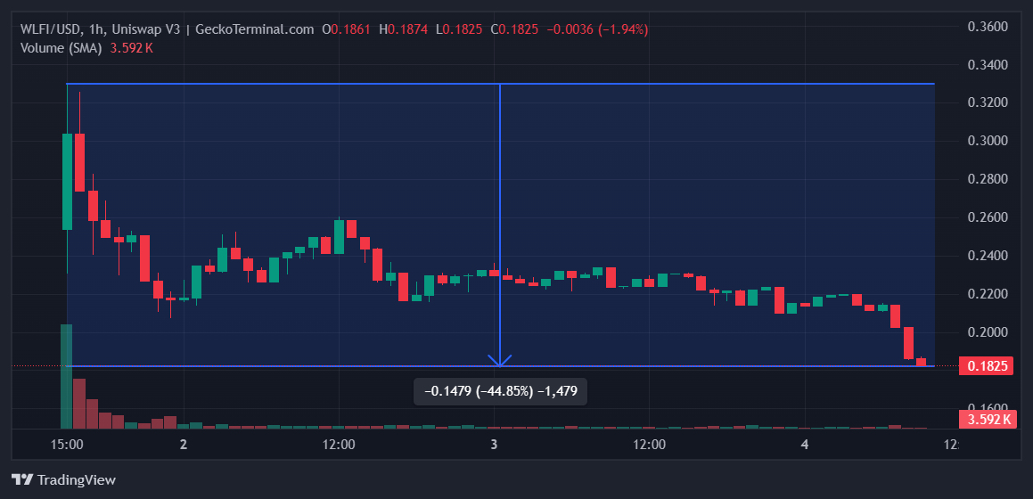 Утро 4 сентября 2025 года криптовалюта Трампа WLFI, которую выпустили в рамках DeFi-проекта президента World Liberty Financial, начала с обновления минимума. В первый день торгов монета торговалась по $0,33. На момент написания обзора, монета торгуется по $0,18. Это минимум за все время.