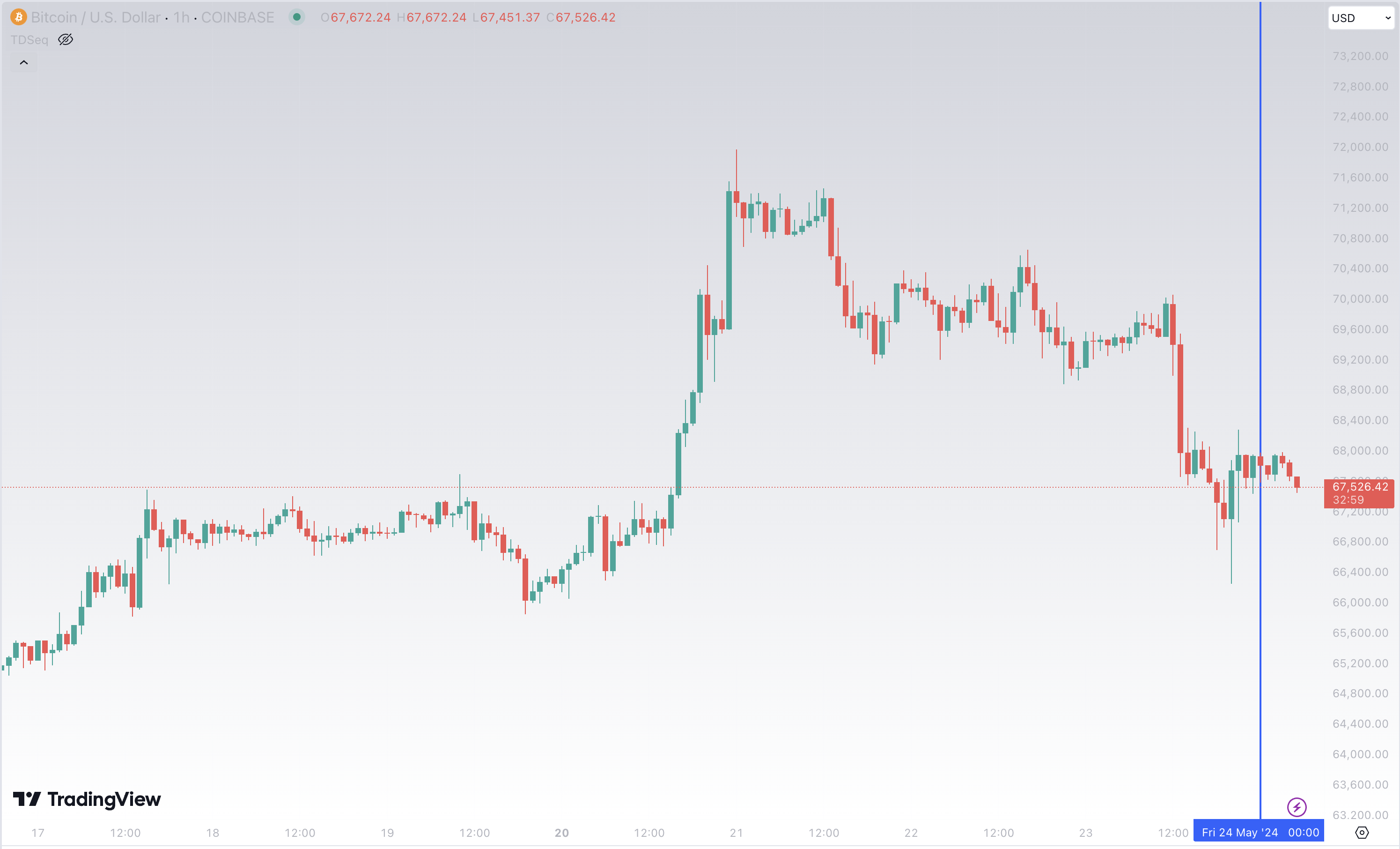 По состоянию на 05:37 (МСК), биткоин (BTC) торгуется по $67 526 (1 токен в рублях — ₽6 120 286). Минимум биткоина за 24 часа — $66 606, максимум — $69 999.