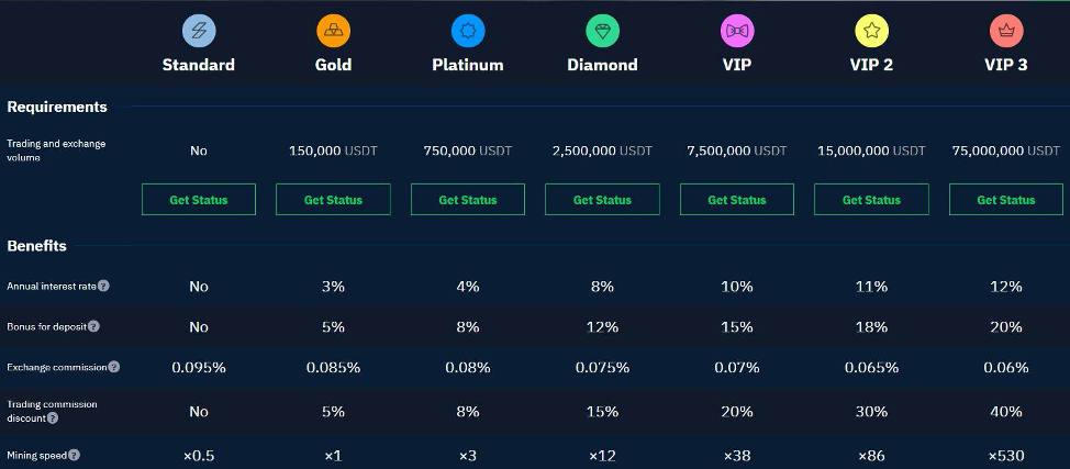 Программа лояльности StormGain – одно из главных преимуществ платформы. Она включает бонусы для пользователей, набор которых зависит от активности клиента: чем выше ваша активность, тем выше ваш статус (Gold, Platinum, VIP и т. д.). Каждый уровень подразумевает дополнительные возможности, например, скидки на комиссии, бонусы на депозиты и процентное вознаграждение на все криптоактивы, хранящиеся в системе.