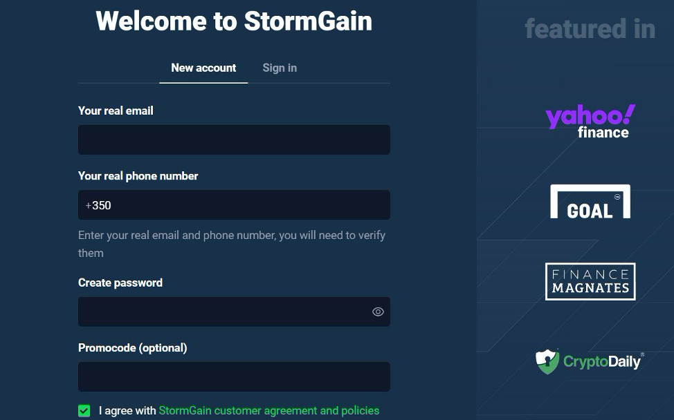 Процедура регистрации простая и понятная. Скачайте мобильное приложение или перейдите на сайт. После этого придумайте логин и пароль. На всё уйдёт не больше минуты. Став новым пользователем, вы получите полный доступ к платформе и демо-счету, чтобы потренироваться в торговле. Для начала торговли на реальном аккаунте нужно пополнить кошелёк StormGain на сумму, эквивалентную 50 USDT или больше.
