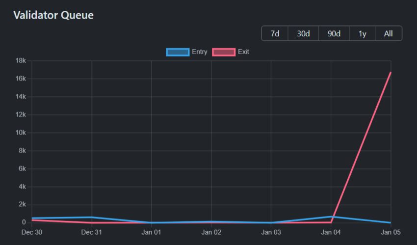 В очереди на вывод средств из стейкинга Ethereum (ETH) сейчас находится почти 16 тыс. валидаторов. Это стало рекордным показателем за всю историю блокчейна второй криптовалюты