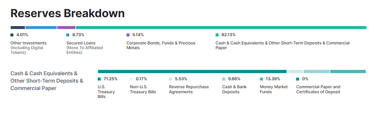 На официальном сайте Tether говорится, что компания хранит более 80% обеспечения стейблкоина USDT в наличных средствах, денежных эквивалентах и в краткосрочных процентных вкладах, а также коммерческих бумагах. Еще более 5% резервов распределено в корпоративных облигациях, фондах и драгоценных металлах. Оставшаяся часть процентов разделена на обеспеченные кредиты и цифровые токены. Всего по состоянию на 31 декабря 2022 года у Tether под управлением было чуть более $67 млрд.