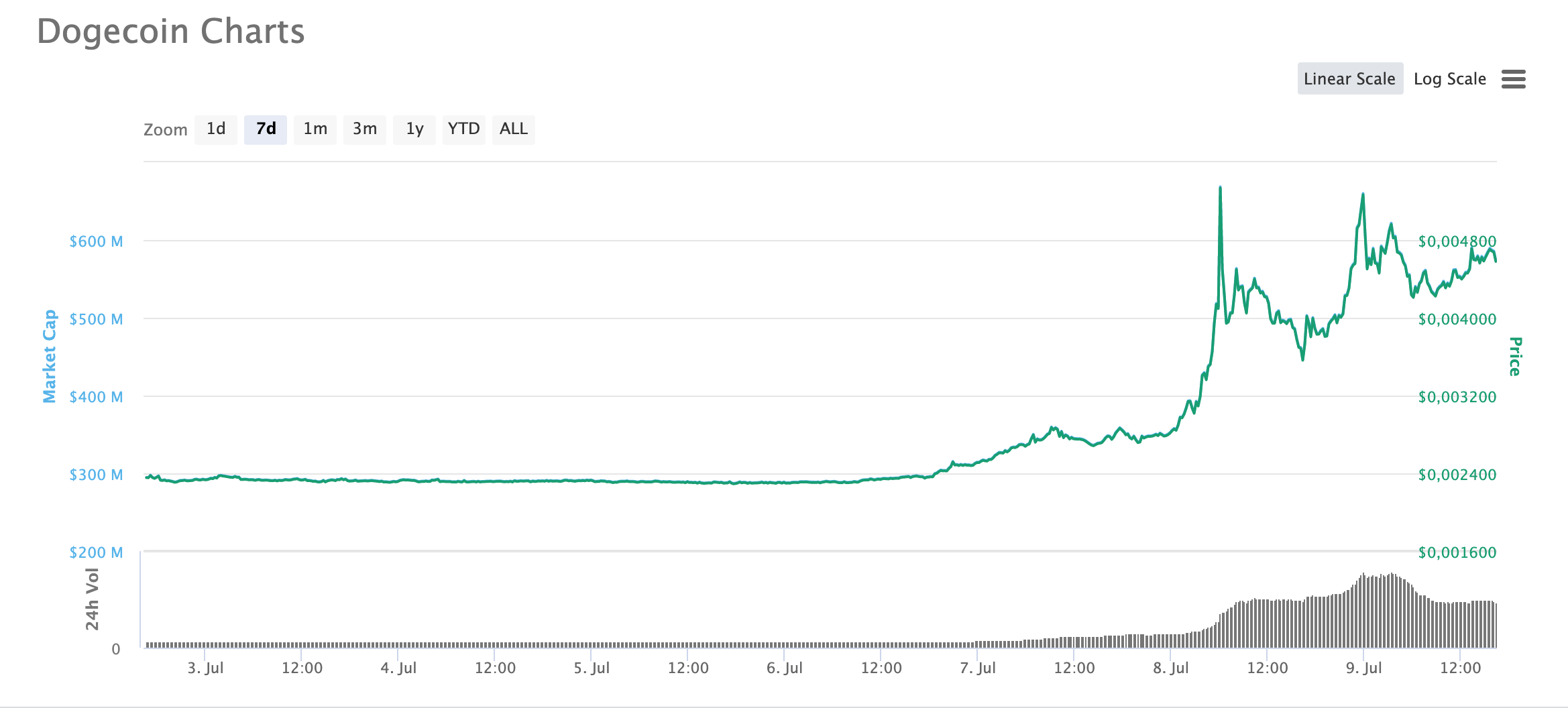 Многие влиятельные люди, включая Элона Маска, обращали внимание на монету. Такой органичный маркетинг привлекает внимание к DOGE. Последним поводом для взлета монеты стали вирусные видео в социальной сети TikTok, призывающие купить DOGE. Буквально за несколько дней ее цена взлетела более чем на 100% буквально на пустом месте.