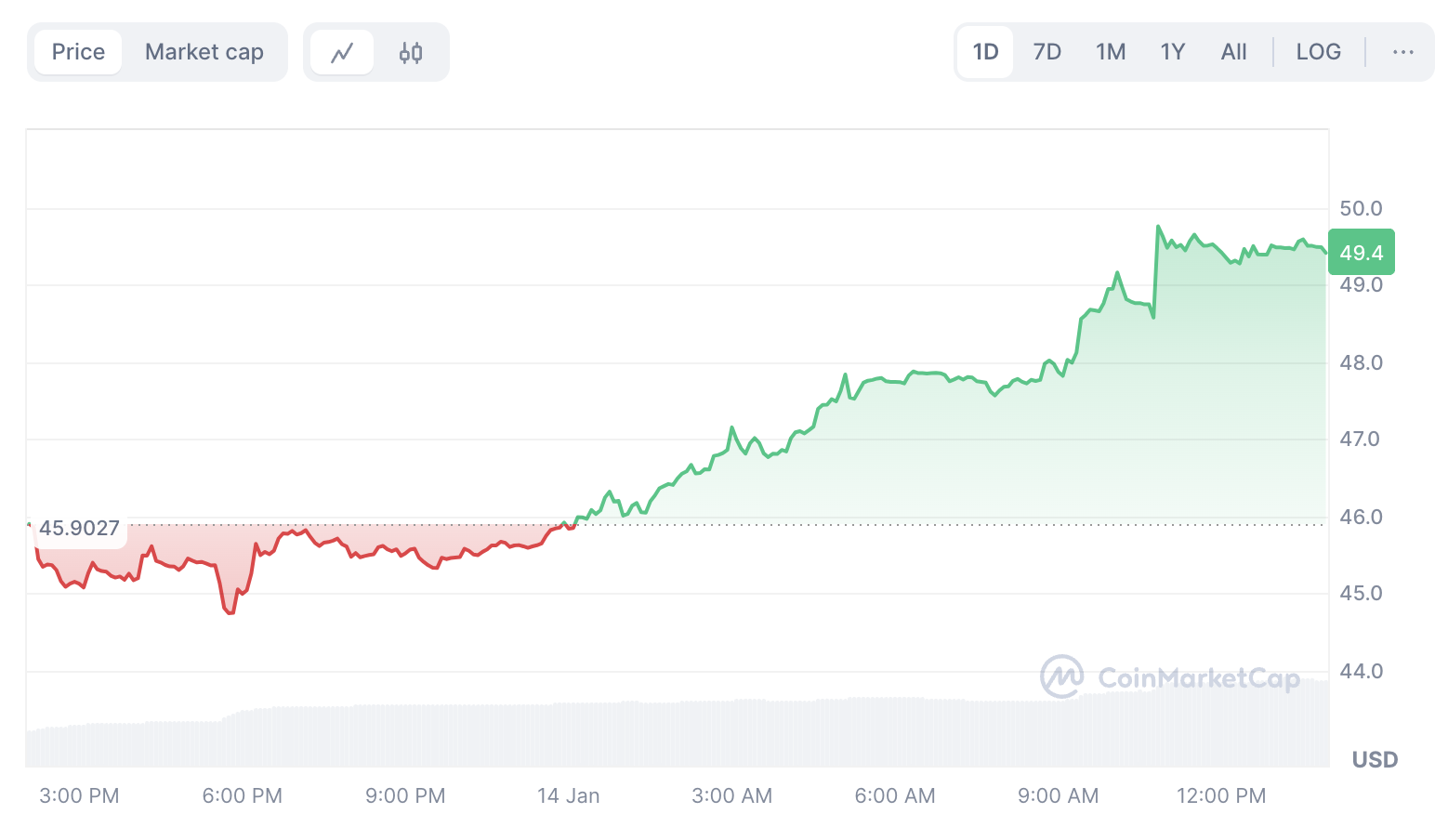 По данным CoinMarketCap, на момент написания материала OKB торгуется по $49,43. За последние сутки цена актива подскочила более чем на 7%. Его капитализация в настоящее время превышает $2,9 млрд.
