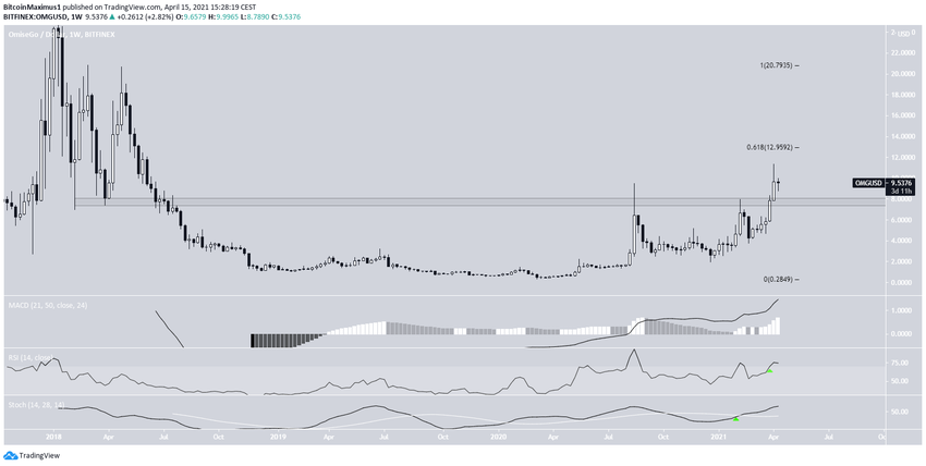 После многочисленных неудачных попыток курс OMG смог, наконец, совершить в начале апреля бычий пробой области долгосрочного сопротивления $7.80.