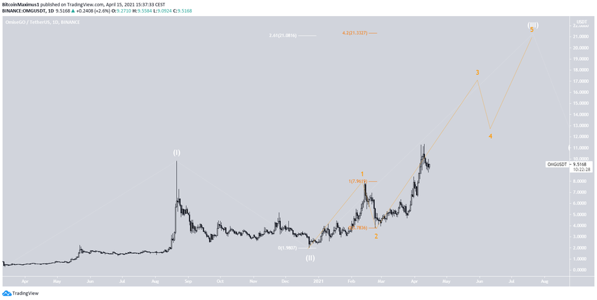 Похоже, курс OMG находится внутри расширенной волны три (белый цвет), потенциальной целью которой является область $21. Это соответствует выделенной нами ранее области долгосрочного сопротивления.