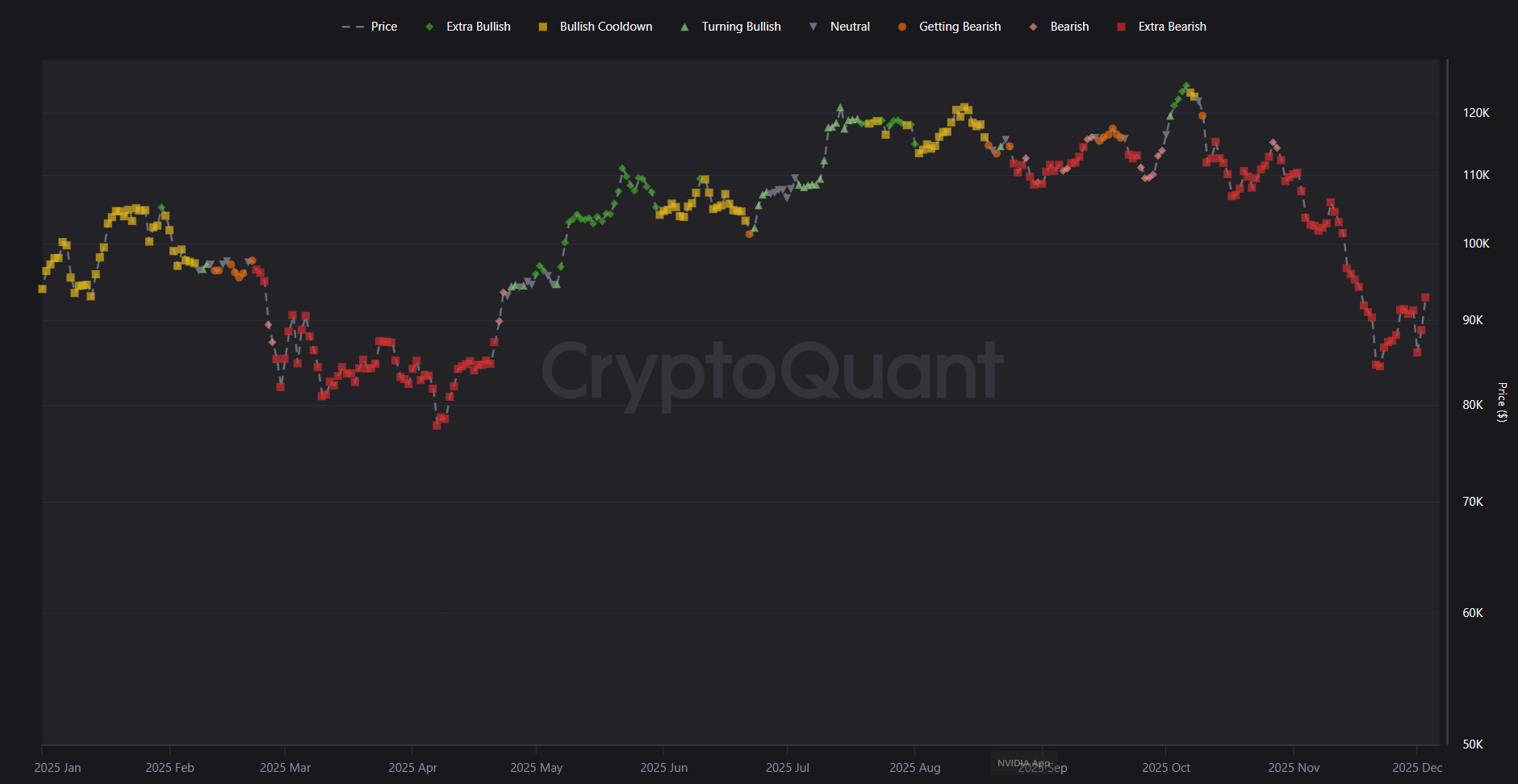 Sponsored SponsoredМодель, наложенная на график цены, трансформировалась из сигналов «экстра-роста» в начале года к устойчивым значениям «снижения» в осенний период. Даже недавнее восстановление к $92 000 классифицируется системой как ралли в рамках нисходящего тренда. Подобное часто наблюдается в фазах распределения активов на пиках цикла.