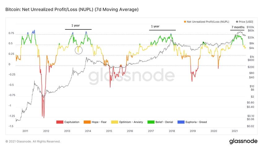 Если тогда рынок сформировал вершину, то это стало бы единственным случаем за всю историю валюты, когда показатель NUPL так и не пересек отметку 0,75 перед запуском медвежьего рынка.