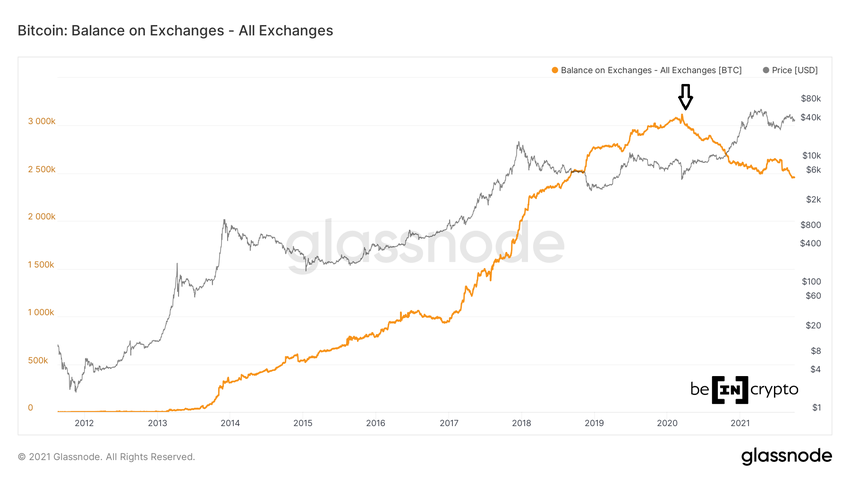 В мае в течение недолгого времени запасы BTC на криптобиржах увеличивались, однако потом они начали сокращаться и 26 сентября достигли годового минимума.