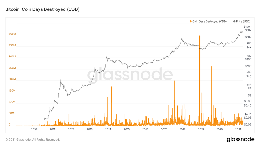 Ончейн-показатель CDD указывает на то, что ходлеры фиксировали прибыль вблизи $40 000 (максимум декабря 2020 года) С тех пор их активность снизилась.