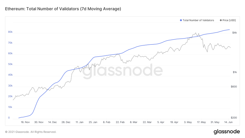Статистика отражает последовательное увеличение числа валидаторов в сети ETH 2.0, свидетельствуя об увеличении количества токенов, которые вносятся на депозиты ETH2.