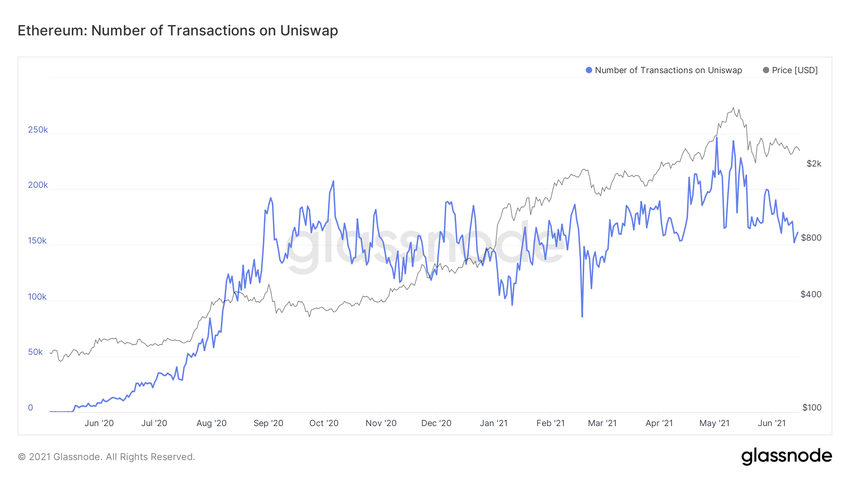 Прежде всего мы рассмотрели ончейн-показатель числа транзакций на Uniswap, которая является крупнейшей децентрализованной биржей (DEX).