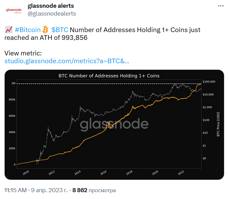 Так, количество ходлеров, на кошельках которых хранится не менее одного биткоина, обновило исторический максимум, достигнув значения 993 856, согласно данным Glassnode.