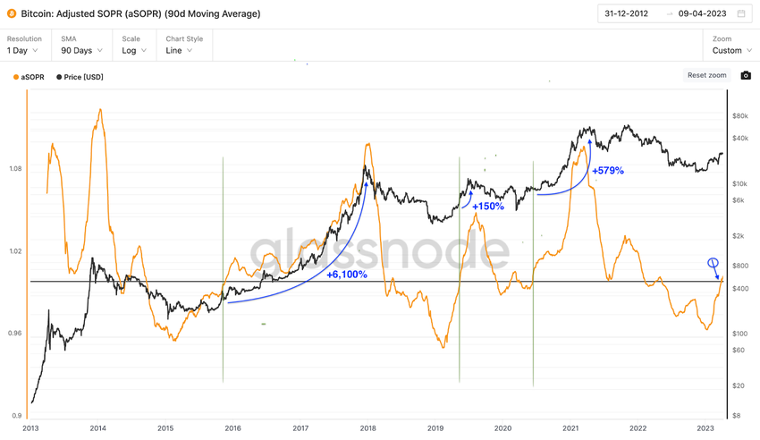 Как показывает история, можно выделить три ярких примера того, как рост aSOPR выше 1 обуславливал энергичное ралли BTC.