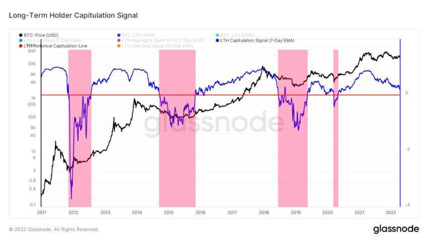 Сейчас этот показатель держится в районе уровня поддержки 62,5%, что сулит биткоину как возможность бычьего разворота тренда, так и риски капитуляции, которые также подтверждаются сигналом о капитуляции долгосрочных ходлеров (Long-Term Holder Capitulation Signal).
