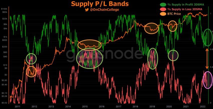 Еще один аналитик @OnChainCollege поделился другим интересным графиком на тему возможной капитуляции BTC-игроков. Он анализировал «полосы прибылей и убытков монет в обращении» (Supply P/L Bands). На графике индикатора одновременно представлены полосы, демонстрирующие усредненные 3-дневные значения объема предложения монет, находящихся как в состоянии прибыли (зеленый цвет), так и убытка (красный цвет).