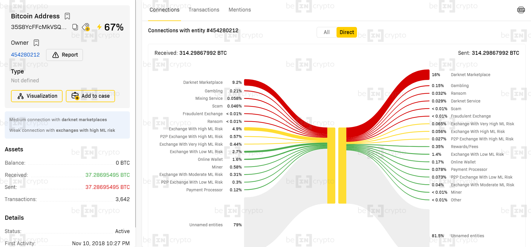 На графике ниже изображена активность одного из самых грязных адресов, полученных в результате сбора. В Crystal определили адрес как целую группу. Это объясняется тем, что полученный редакцией адрес обменника, а также многие другие адреса в сети биткоина, на определенном этапе сходятся в одном месте (адресе).