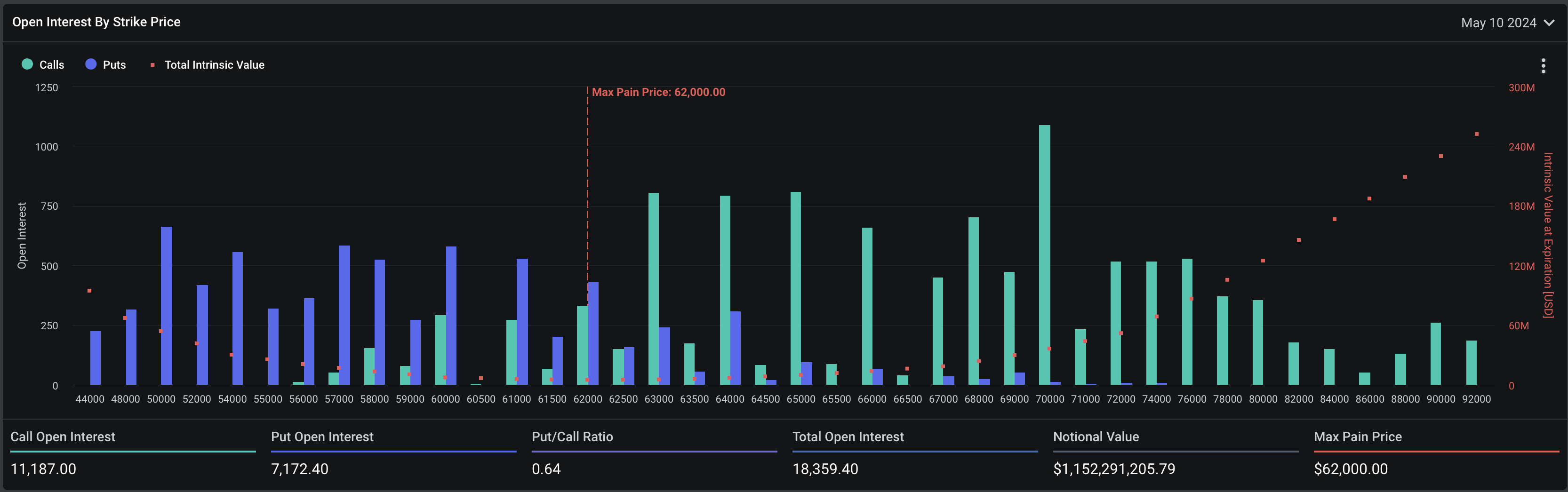 По данным Deribit, соотношение пут и колл опционов на BTC держится на уровне 0,64. Это означает, что трейдеры по-прежнему продают больше коллов или длинных контрактов, чем путов или коротких контрактов. Максимальная болевая точка — то есть цена, при достижении которой актив принесет финансовые потери наибольшему числу держателей, — находится на отметке $62 тыс.