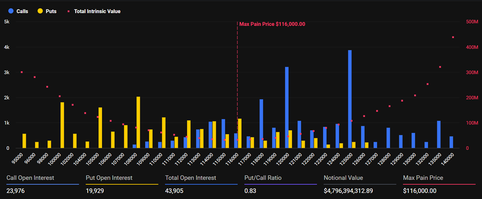 По данным Deribit, открытый интерес по опционам на биткоин составляет 43 905 контрактов номинальной стоимостью $4,79 млрд. Точка максимальной боли (max pain) находится на уровне $116 000 — выше текущей цены. Это указывает на ограниченный потенциал краткосрочного роста.