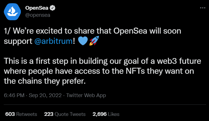 Площадка для торговли невзаимозаменяемыми токенами OpenSea скоро добавит поддержку сайдчейна Arbitrum. Об этом представители площадки сообщили в твиттере.
