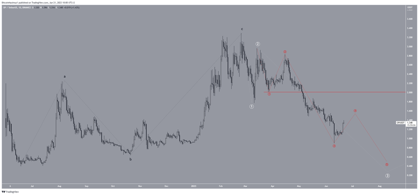 Если это действительно так, то Optimism находится в четвертой подволне (красный цвет) волны три (белый цвет). Таким образом, после завершения текущего отскока цена снова снизится, упав до нового годового минимума. Первая цель и потенциальное дно для такого движения располагается в районе $0,30.