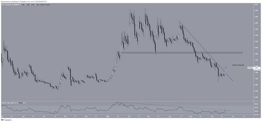 Цена Optimism совершила бычий пробой линии нисходящего сопротивления, которая присутствовала на графике с 15 апреля. Это сильный признак того, что предыдущая коррекция, возможно, закончилась.
