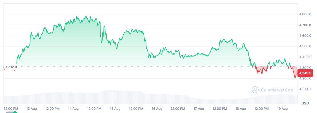 На момент написания обзора, криптовалюта торгуется по $4 249, что на 13,35% ниже максимума. Напомним, пик стоимости ETH зафиксирован 16 ноября 2021 года на уровне $4 891.