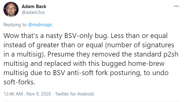 Как объяснил криптограф Адам Бэк, ошибка заключается в использовании правила «меньше или равно» вместо «больше или равно» количество подписей в мультиподписи, что привело к эксплойту.
