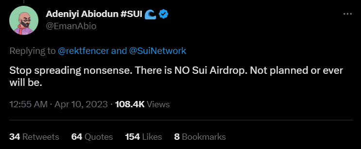 Призыв Абиодуна прозвучал на фоне спекуляций криптосообщества на тему того, как принять участие в потенциальной раздаче токенов SUI. Многие сайдчейны, например, Polygon и Arbitrum, уже обзавелись собственными токенами через аирдроп, однако в Mysten Labs не торопятся с токеномикой.