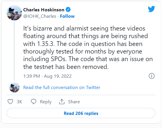 Ранее Хоскинсон вел переписку с критиком, заявившим, что в версии 1.35.2 хардфорка Vasil есть ошибка.