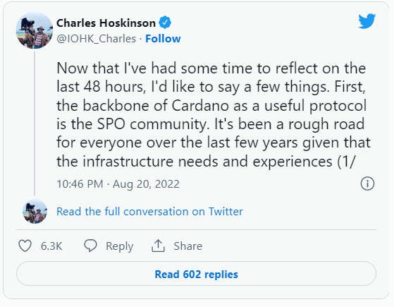Основатель Cardano Чарльз Хоскинсон 20 августа твитнул о том, что сообщество SPO (stake pool operation, или управление стейкинг-пулом) является основой Cardano. Также Хоскинсон признал, что в инфраструктуре блокчейна все еще присутствуют недостатки.
