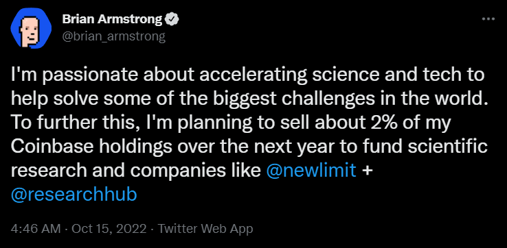 Полученные с продажи акций деньги Армстронг намерен вложить в фирмы по научным исследованиям NewLimit (созданный вместе с Блейком Байерсом) и ResearchHub. Впрочем, планирует ли Армстронг вложить всю сумму от продажи акций, неясно. При этом он заверил, что намерен оставаться на посту главы Coinbase еще очень долго.