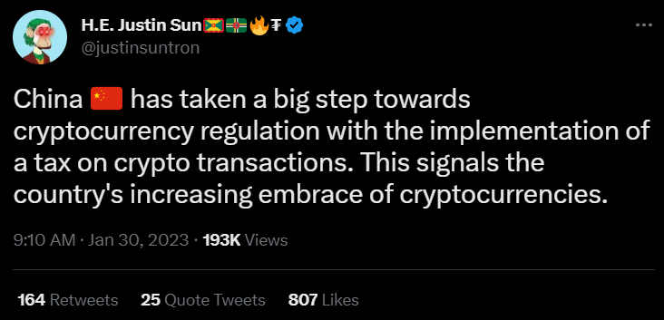 Налогообложение криптовалют в Китае демонстрирует заинтересованность коммунистической партии в легализации рынка. Такую теорию у себя в твиттере выдвинул основатель криптовалютной экосистемы TRON Джастин Сан.