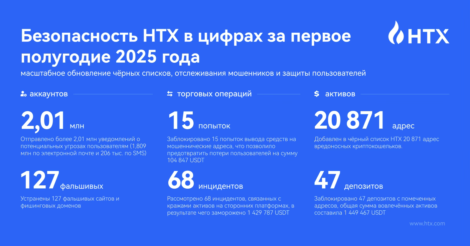 Только за июнь HTX предотвратила 5 мошеннических выводов, заморозила свыше $400 000 на счетах, скомпрометированных на других платформах, добавила 2769 новых адресов в черный список, предотвратив мошеннические депозиты на сумму 21 239 USDT, и закрыла 41 новый фишинговый домен.