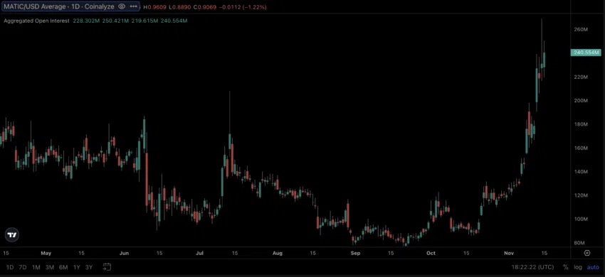 Еще одним важным фактором, способствующим росту цен на MATIC, стала торговая активность на рынке фьючерсов. По данным аналитического трекера криптотрейдинга Coinalyze, открытый интерес по Polygon в ноябре вырос почти вдвое.