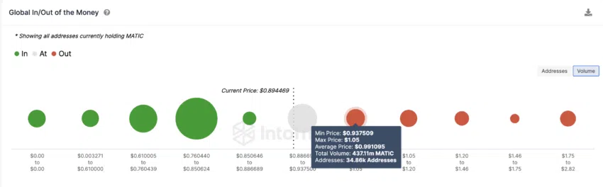 Однако для того, чтобы убедиться в легитимности ралли, быкам придется преодолеть начальное сопротивление на уровне $1. Как показано на графике ниже, 34 860 адресов приобрели 437,11 млн MATIC по средней цене $0,99. Если они выйдут из позиций раньше времени, курс актива может откатиться к ближайшей поддержке.