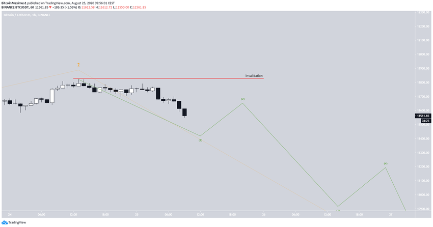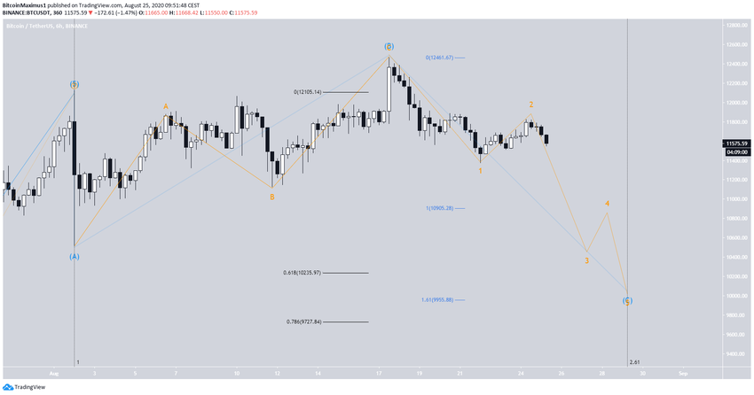 В результате недавнего падения биткоин, вероятно, сформировал вершину второй подволны (оранжевый паттерн на графике) волны С (голубой паттерн), формирование которой началось 17 августа.
