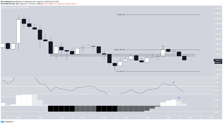 Биткоин укреплялся с 22 августа, когда был достигнут минимум $11 367. Подъем продолжался до 24 августа, когда котировки, казалось пробили зону сопротивления $11 700. Однако достигнув уровня 0.382% коррекции Фибоначчи относительно предыдущего медвежьего хода, монета совершила отскок, и теперь уровень $11 700 снова выступает в роли сопротивления. При этом RSI опустился под отметку 50, а MACD также снизился – оба индикатора подают медвежьи сигналы.\