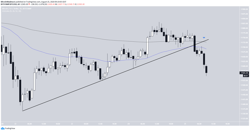 На часовых графиках видно, что цена следует за линией восходящей поддержки с 22 августа, когда был достигнут вышеупомянутый минимум. Накануне битокин слегка укрепился, но сегодня возобновил снижение, угрожая отметке $11 500, утрата которой откроет путь к минимуму $11 367.