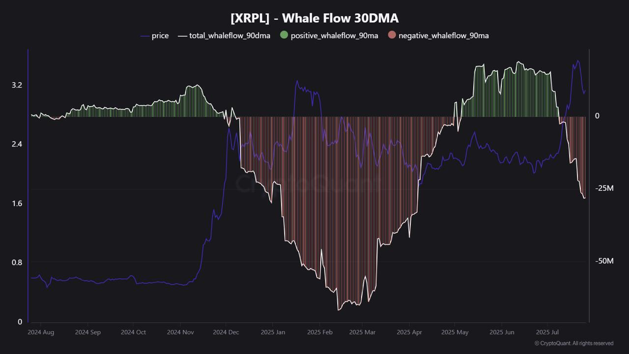 Похожий сценарий может разворачиваться и сейчас, когда киты фиксируют прибыль на локальных максимумах. Несмотря на рост цен, ончейн-активность ослабевает. Разрыв между ростом цен и медвежьими потоками китов вызывает вопросы о стабильности текущего уровня XRP.