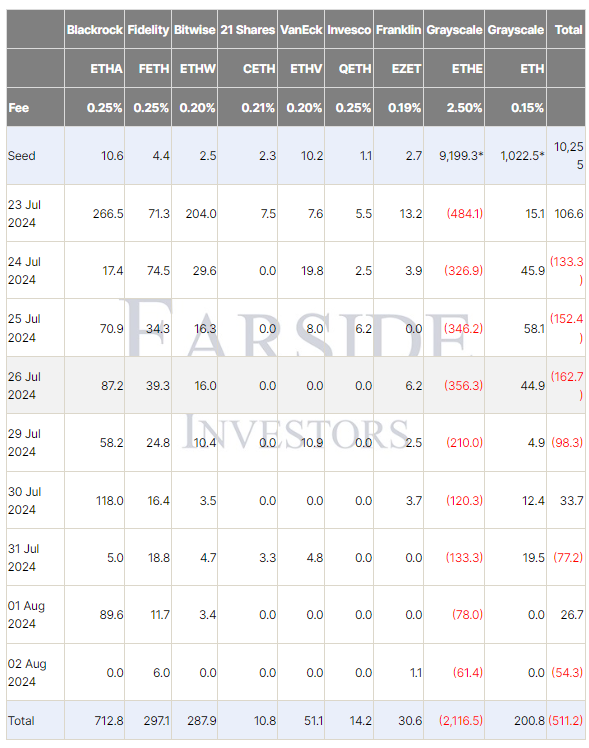 По состоянию на 29 июля из ETHE на Coinbase инвесторы вывели около 108 800 ETH на общую сумму в $367,6 млн. Ко второму августа показатель снизился до 24 900 ETH стоимостью примерно в $78,4 млн.