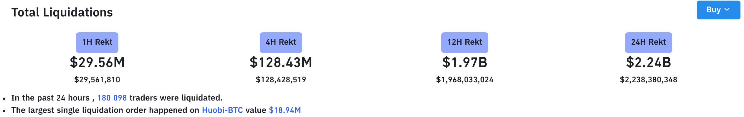 За последние 24 часа почти 200 тыс. трейдеров ликвидировали свои позиции. Отчет Bybit показал, что за этот период объем ликвидаций на рынке фьючерсов достиг $2,23 млрд.