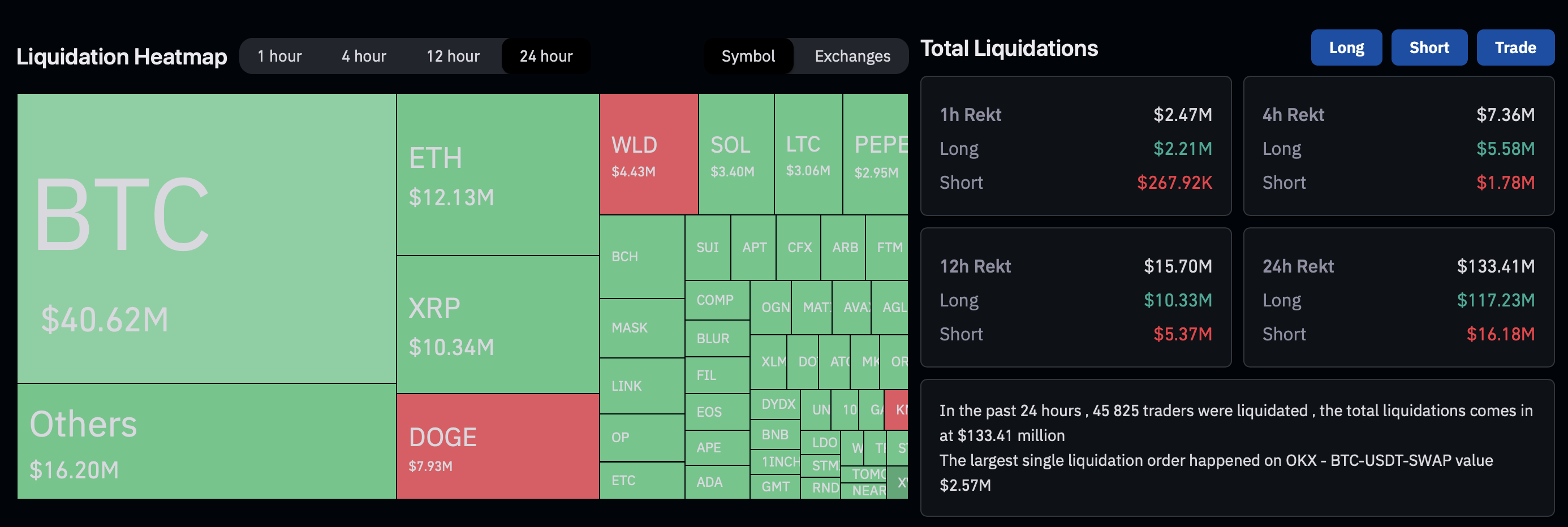 Общая сумма ликвидаций на крипторынке за последние 24 часа подобралась к отметке $135 млн. Большая часть закрытых позиций пришлась на BTC и ETH.