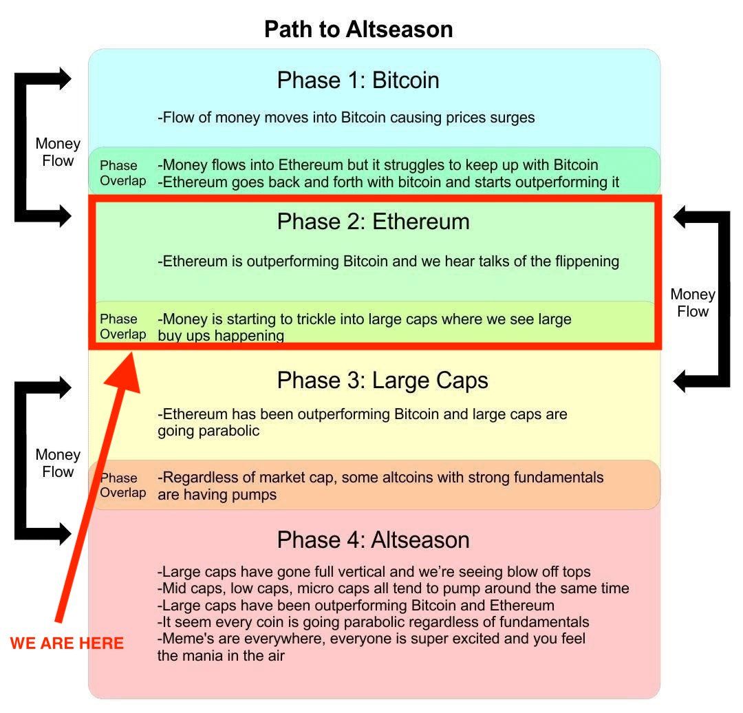 Следом идет фаза 3, когда Ethereum продолжит превосходить биткоин, а крупные альткоины начнут значительно расти.