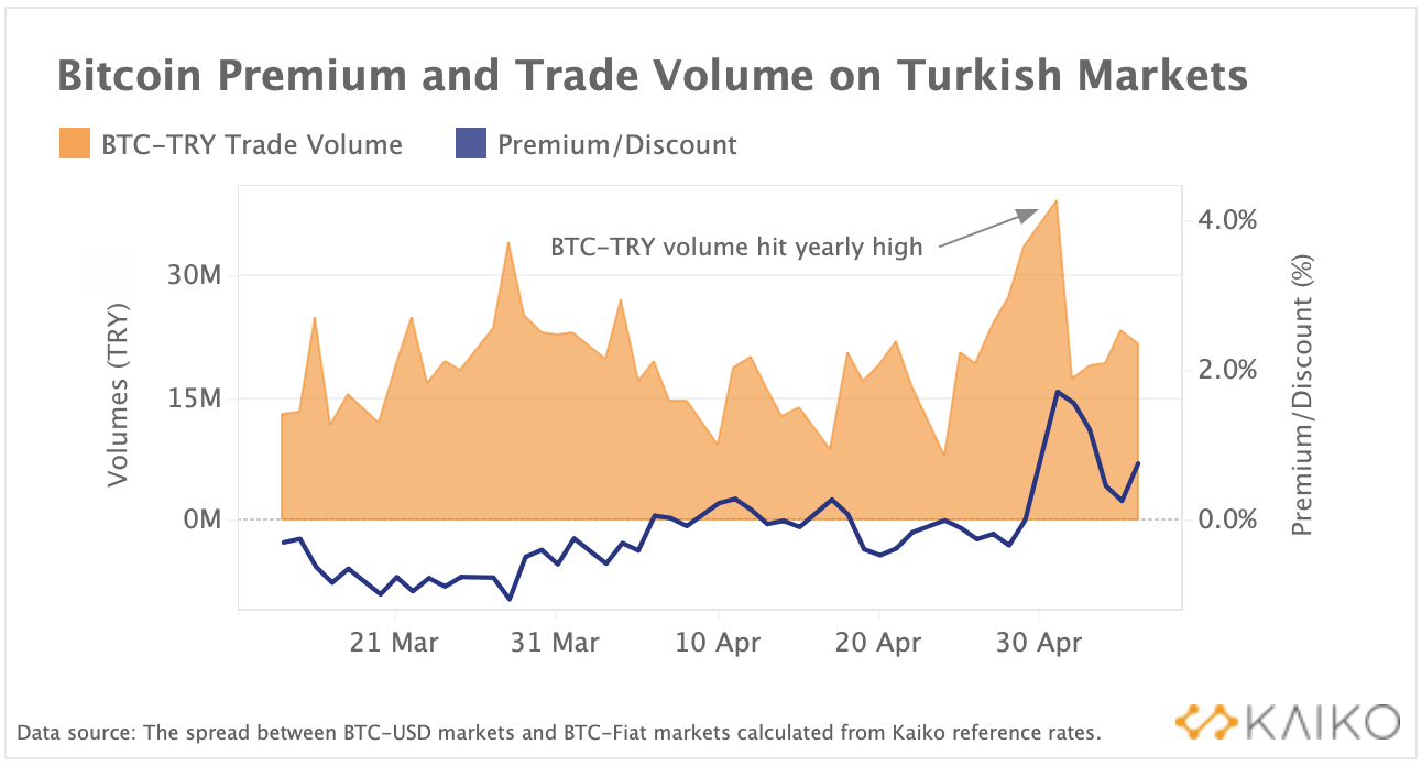 Более того, в начале мая премия (дополнительная наценка) на биткоин на турецких рынках выросла до 1,7%, поскольку в апреле инфляция достигла 70%, утверждают в Kaiko. Также с начала геополитического кризиса, развернувшегося между Украиной и Россией, активно растет объемов торгов в парах BTC/TRY и USDT/TRY.