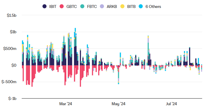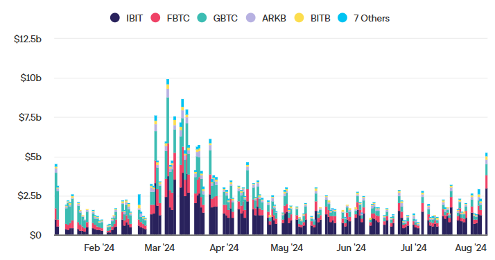 Также Райан Ли обратил внимание на активность на рынке спотовых биткоин-ETF. На фоне падения рынка торговый объем инструментом вернулся к значениям марта 2024 года.
