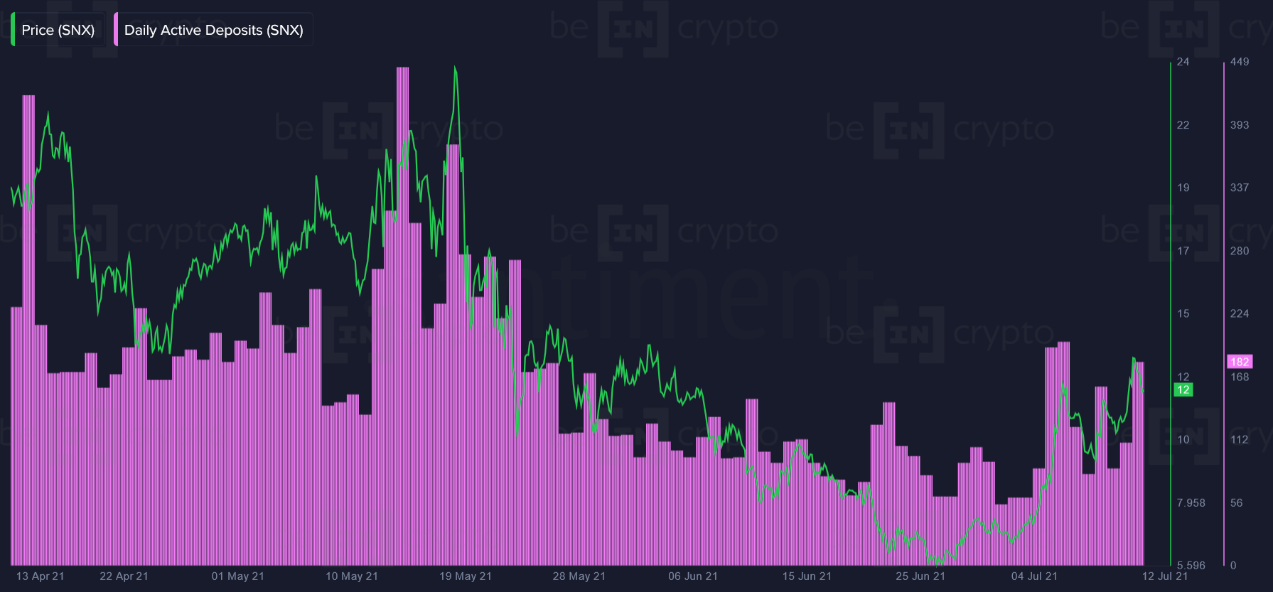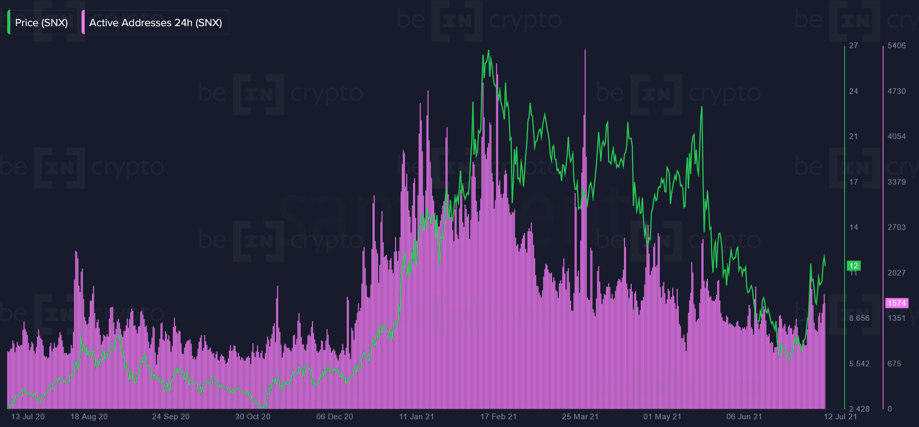 Пока что ончейн-активность SNX остается в восходящем тренде. Однако неясным остается то, насколько устойчив тренд. Аналитики советуют следить за активностью ежедневных активных адресов SNX, а также за совокупным балансом китов. Цена SNX в паре SNX/USDT на момент написания материала составляет $12,12.